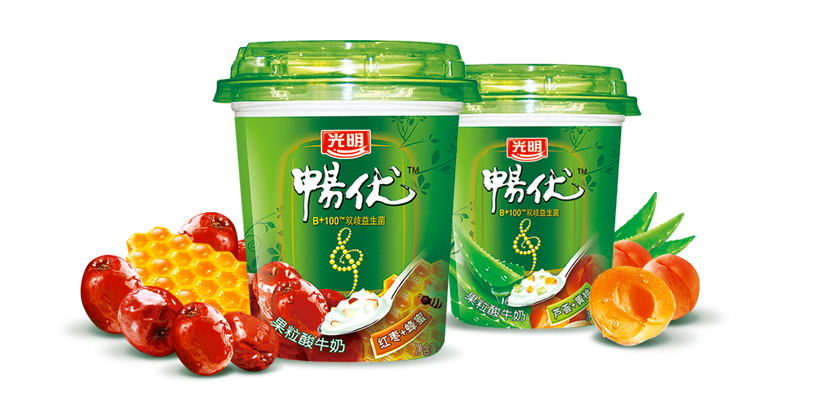 光明乳业是中国领先的乳制品制造商之一,以高端酸奶品牌“畅优”著称,其中含有一系列独创的B+100益生菌,有助于增进消化系统健康。2007年,光明乳业推出230克大果粒新系列美味酸奶,其包装体现了新鲜水果的清爽和饱满感。