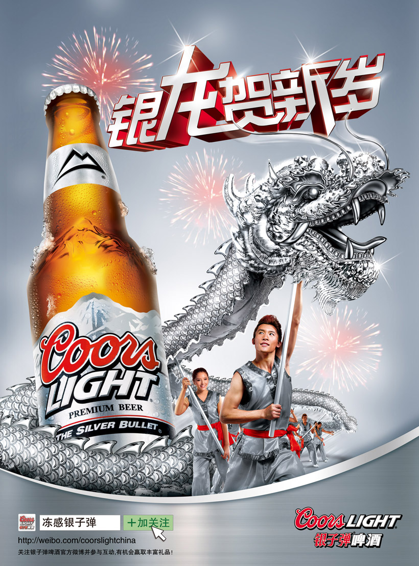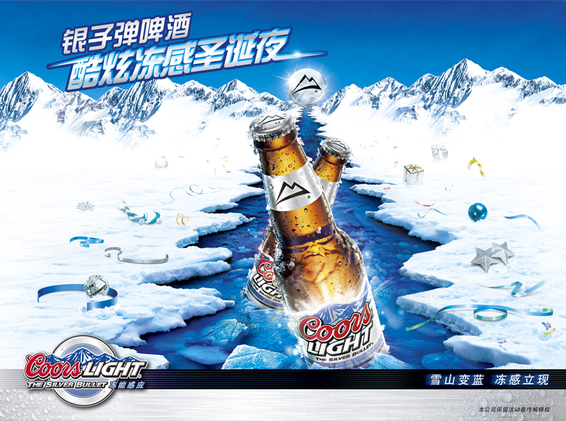 作为美国的全球性品牌,银子弹主要在中国各大城市的酒吧、酒馆和卡拉OK销售,因此客户要求通过大量促销材料提高品牌知名度,尤其是在重要假日、文化节、音乐会和体育赛事期间。考虑到银子弹的目标群体是25-35岁的年轻人,因此品牌把自己描述为冷艳而清新,以期与这个主要群体特征产生共鸣。